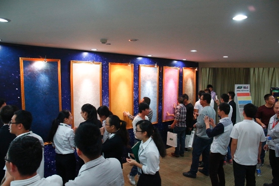 隨后三棵樹產品部副部長黃博思詳細介紹了傾城之虹、流金幻彩、夢幻威尼斯、巖紋、羅馬經典、流光溢彩六大系列藝術漆的特質與涂刷效果。與市場上同行產品相比,源自意大利的三棵樹藝術漆有更齊全的產品線、更多樣的品類、更豐富的藝術效果等優勢。黃部強調,三棵樹除了提供優質的藝術漆產品,還從意大利請來技術專家,對技服人員進行專業培訓,讓每個消費者從涂裝方案到施工等各環節都享受一體化的貼心服務。