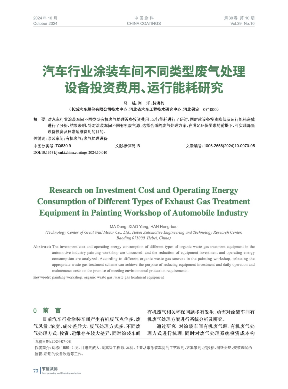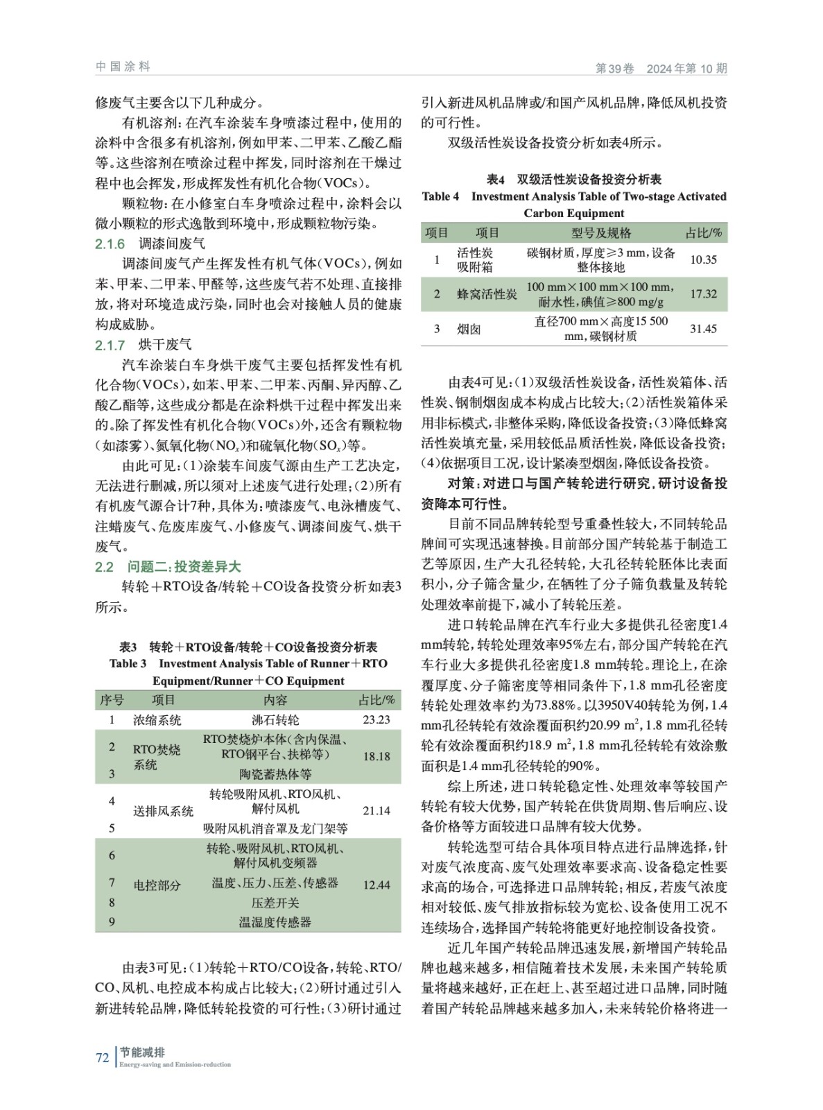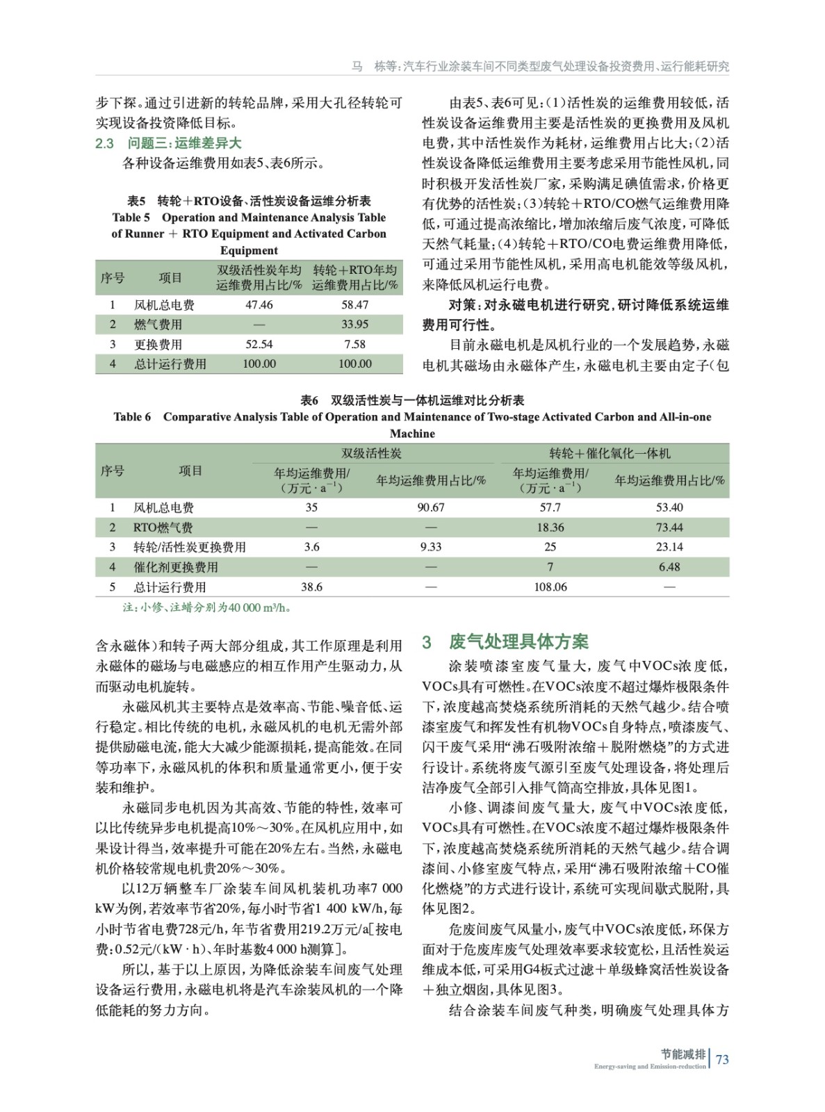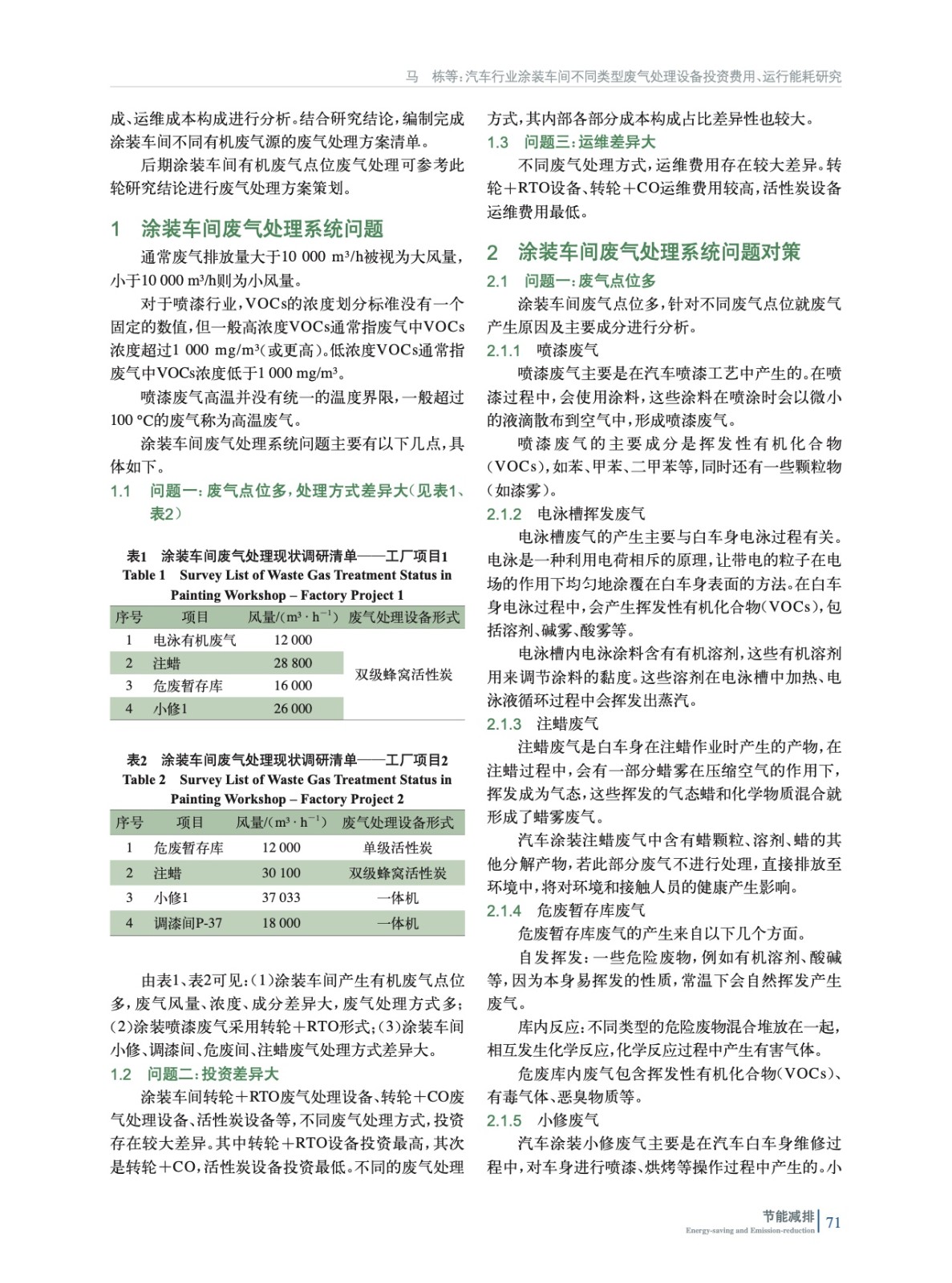 汽車行業涂裝車間不同類型廢氣處理設備投資費用、運行能耗研究