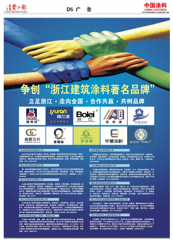 《中國涂料報》(電子版)的一切內容(包括但不限于文字、圖片、PDF、圖表、標志、標識、商標、版面設計、專欄目錄與名稱、內容分類標準以及為讀者提供的任何信息)僅供中國涂料信息網讀者閱讀、學習研究使用,未經中國涂料雜志社有限公司及/或相關權利人書面授權,任何單位及個人不得將《中國涂料報》(電子版)所登載、發布的內容用于商業性目的,包括但不限于轉載、復制、發行、制作光盤、數據庫、觸摸展示等行為方式,或將之在非本站所屬的服務器上作鏡像。否則,中國涂料雜志社有限公司將采取包括但不限于網上公示、向有關部門舉報、訴訟等一切合法手段,追究侵權者的法律責任。